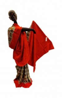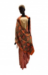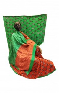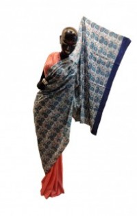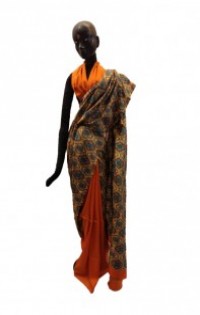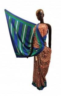 Orange Ananda parrots adorn this half & half heavy printed silk in orange and turquoise blue with an eye catching parrot and floral border & pallu.